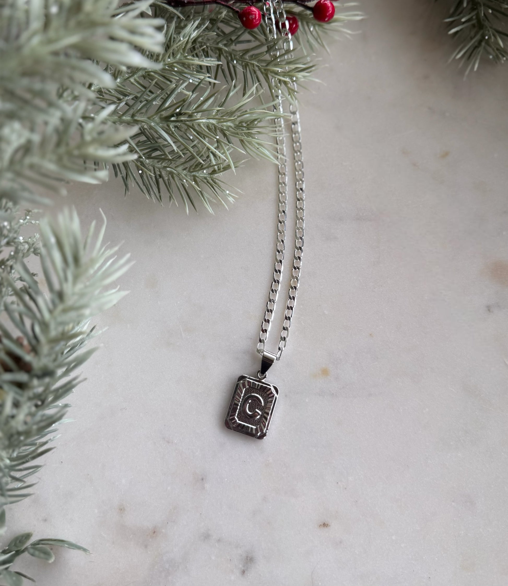 This 2.5mm sterling silver curb Cuban chain features a 24mm x 16mm initial pendant of your choice. Offered in 16, 18, and 20 inch and attaches with a lobster clasp. Please list the initial of your choice in the notes at checkout or send a private message.
