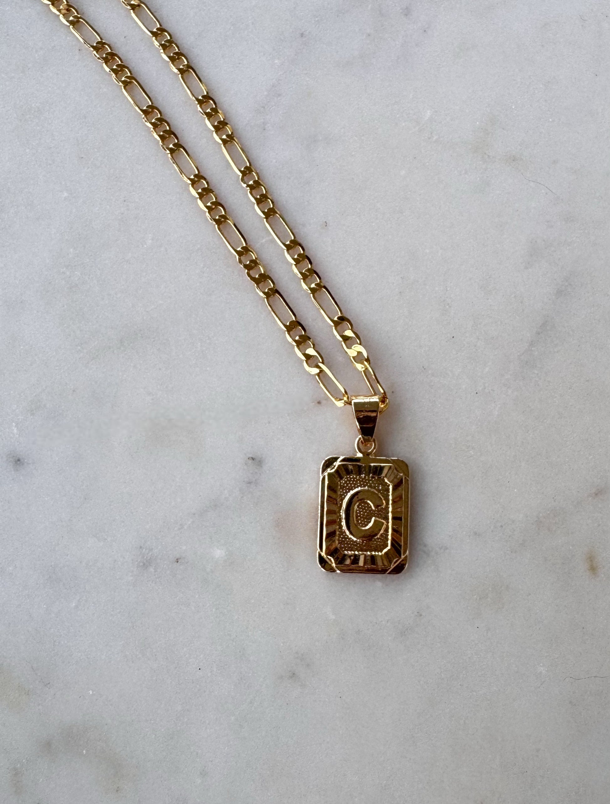 This 2.5mm sterling silver Italian Figaro chain in yellow gold features a 24mm x 16mm gold filled initial pendant of your choice. Offered in 16, 18, and 20 inch and attaches with a lobster clasp. Please list the initial of your choice in the notes at checkout or send a private message.