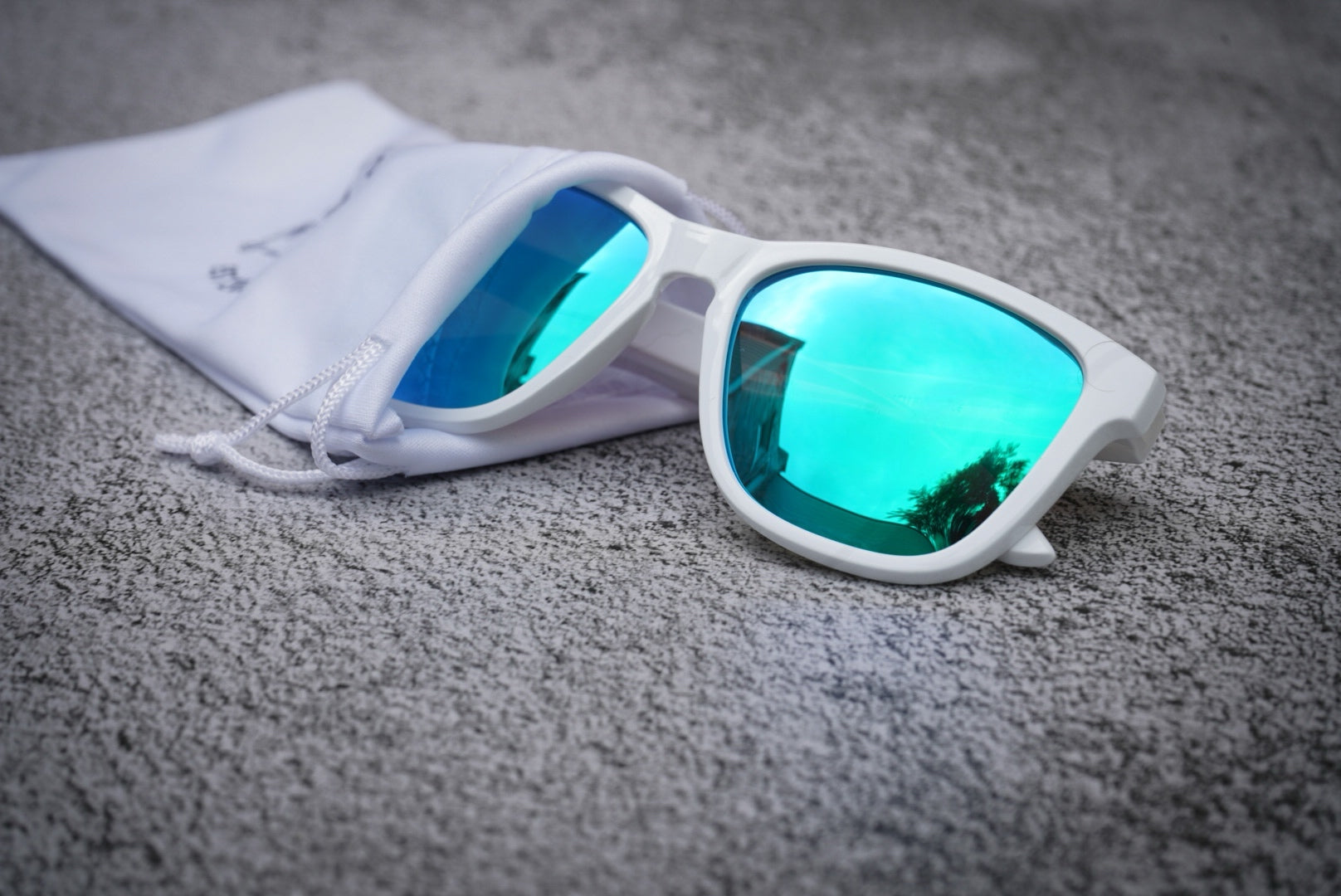 Adult polarized wayfarer style sunglasses with green/blue mirroring