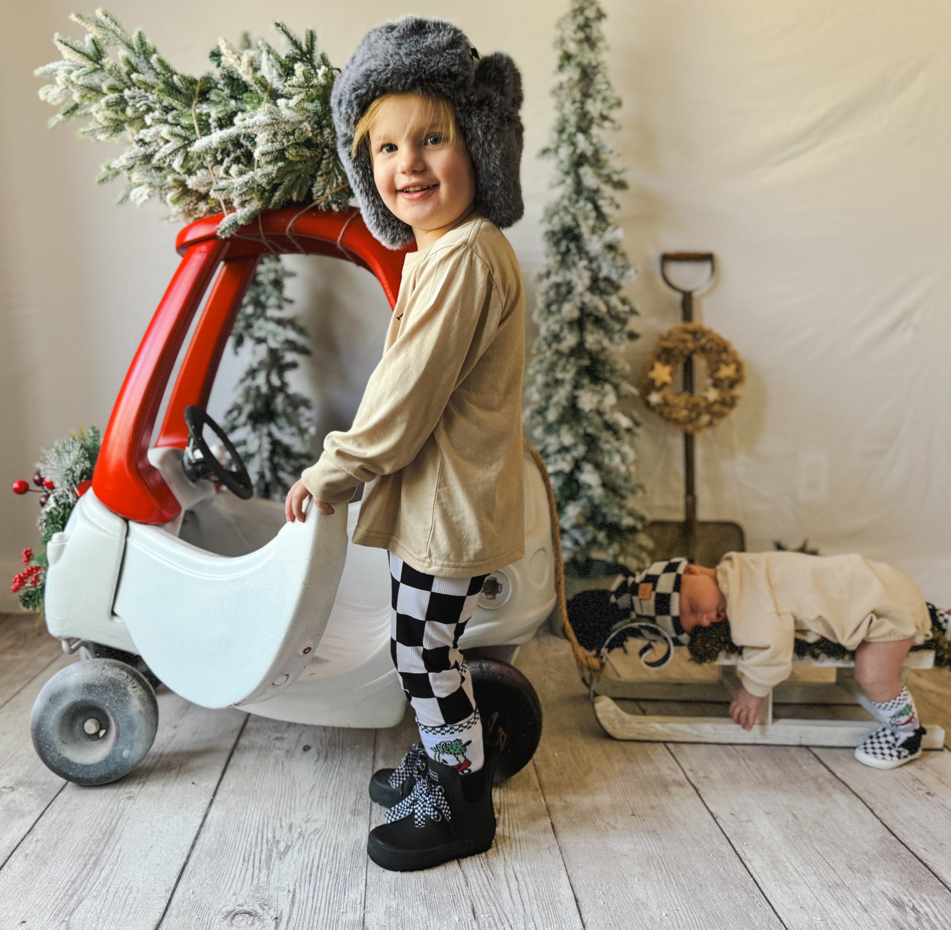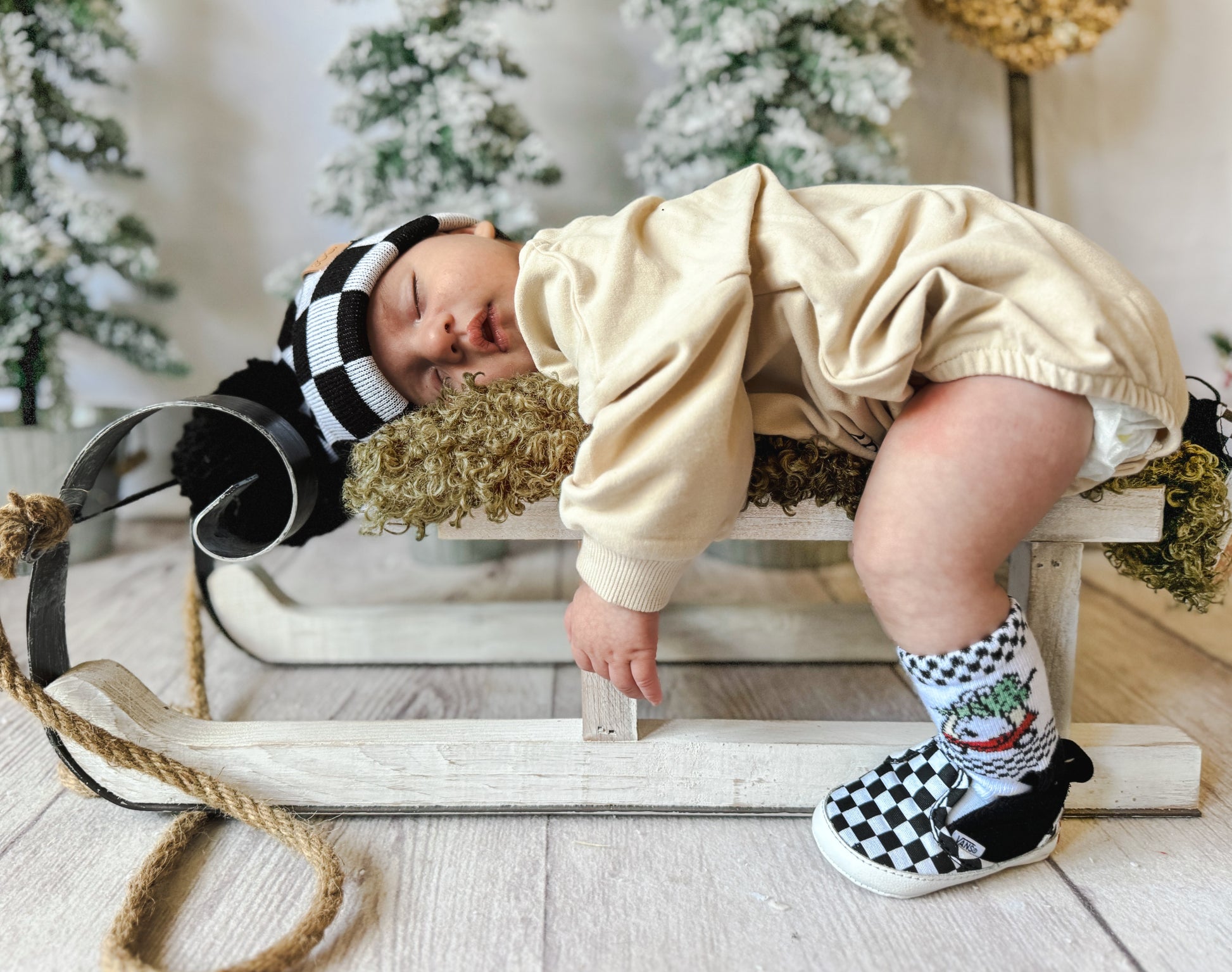 Sizes Infant, Extra Small, Small, Medium have logo grips on the bottom of the feet large have a stitched logo on the bottom of the feet.