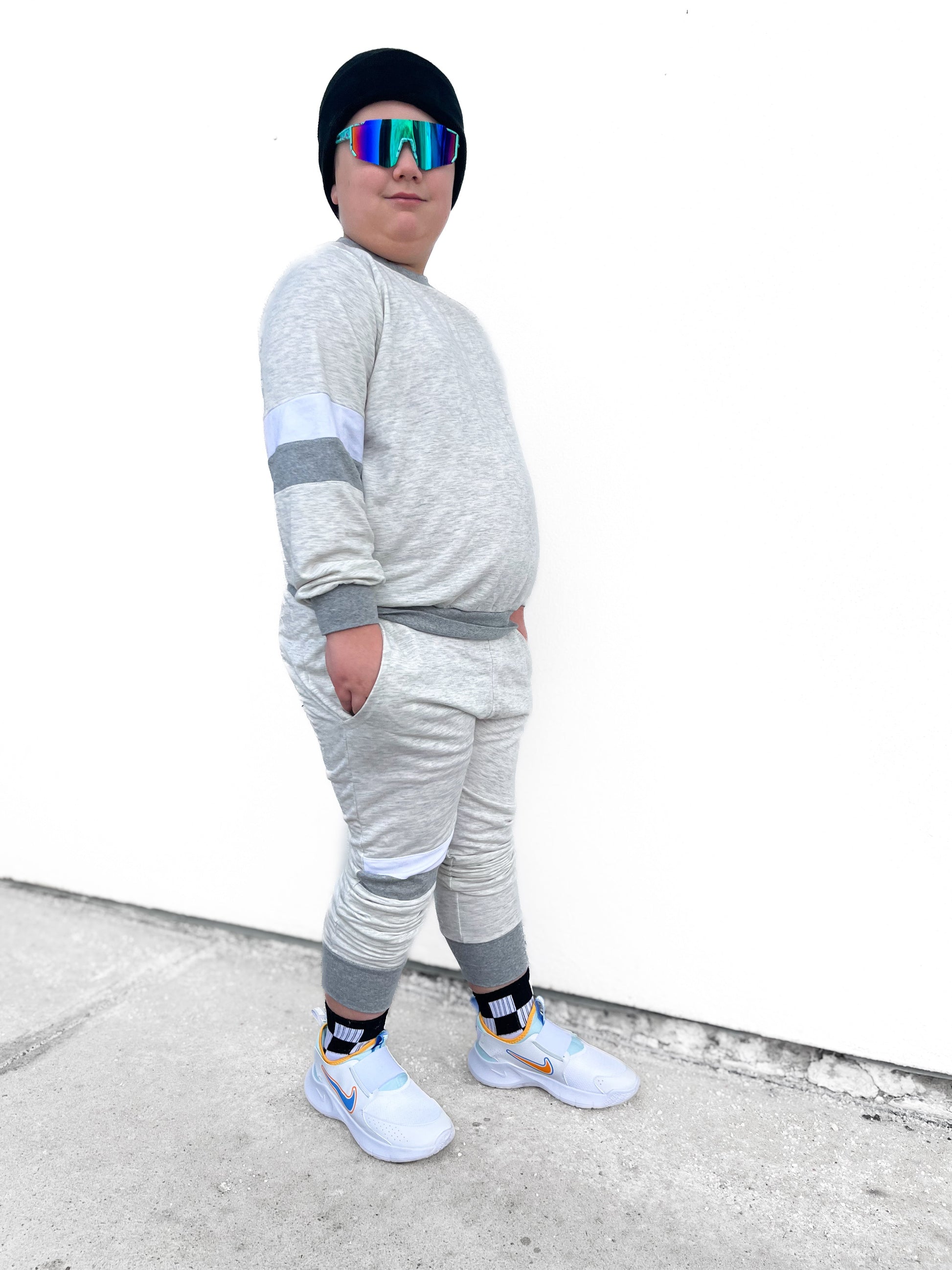 Sizes Infant, Extra Small, Small, Medium have logo grips on the bottom of the feet large have a stitched logo on the bottom of the feet.