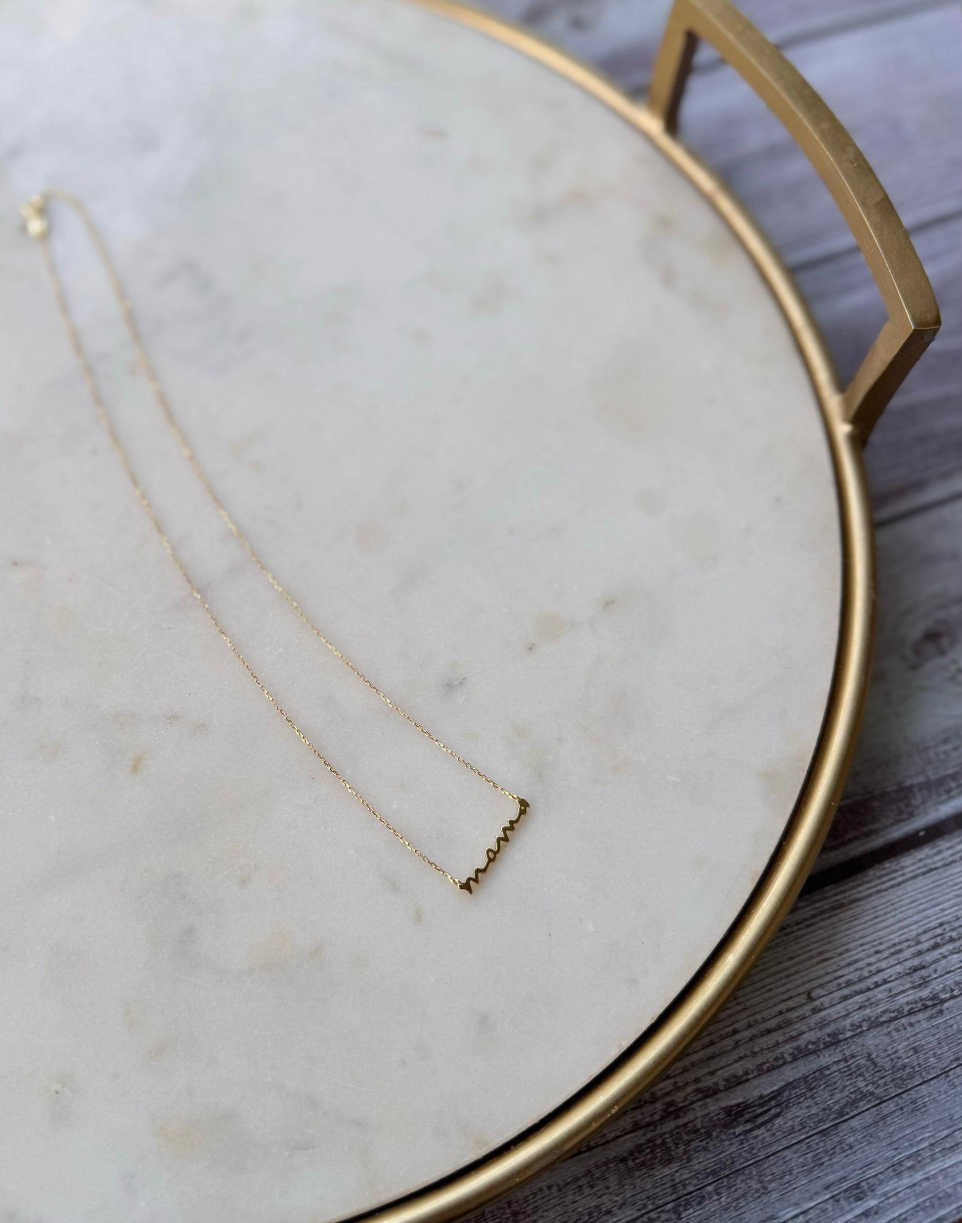 The dainty 3mm Mama Script Necklace features the word "mama" in lowercase minimalist script font. It sits beautifully on the neckline and looks stunning, whether worn alone or layered. Adjustable 16 to 18 inches.