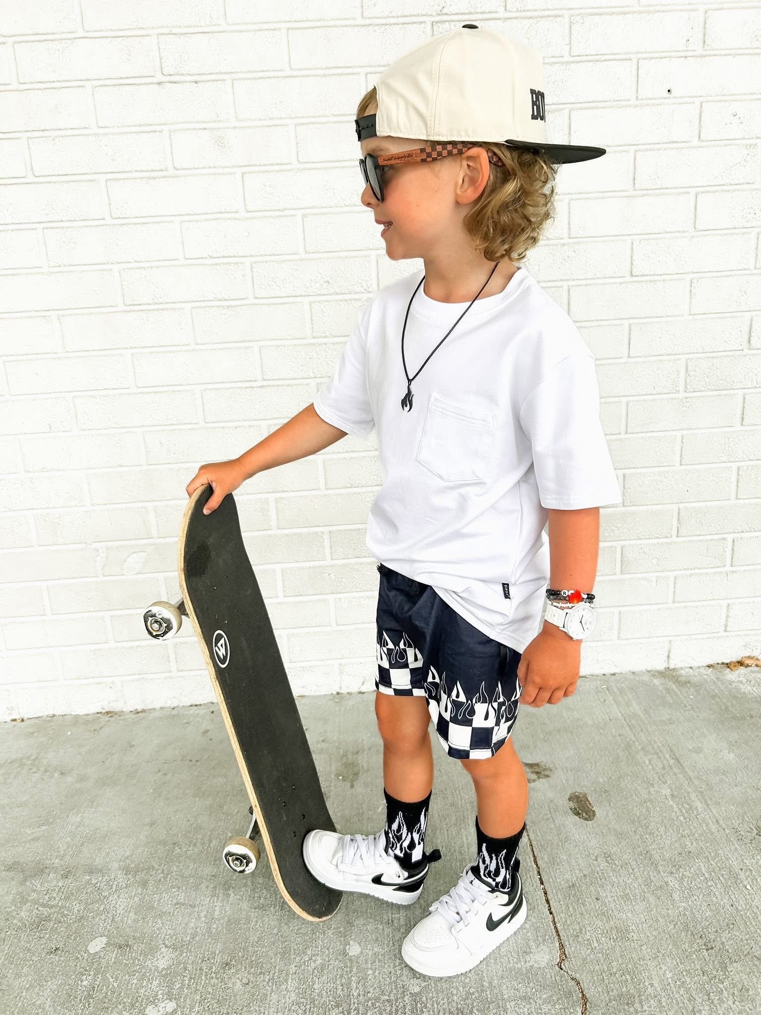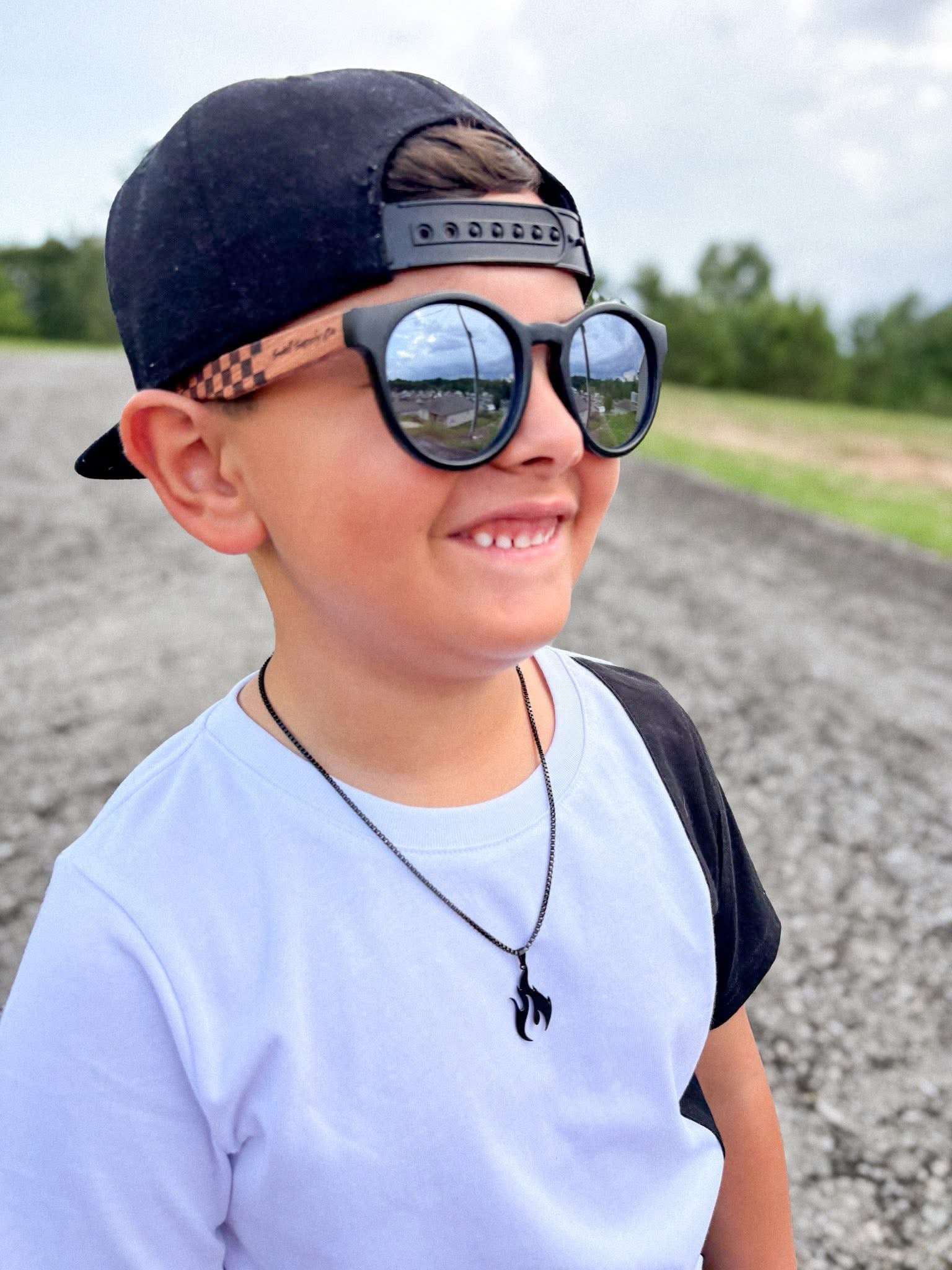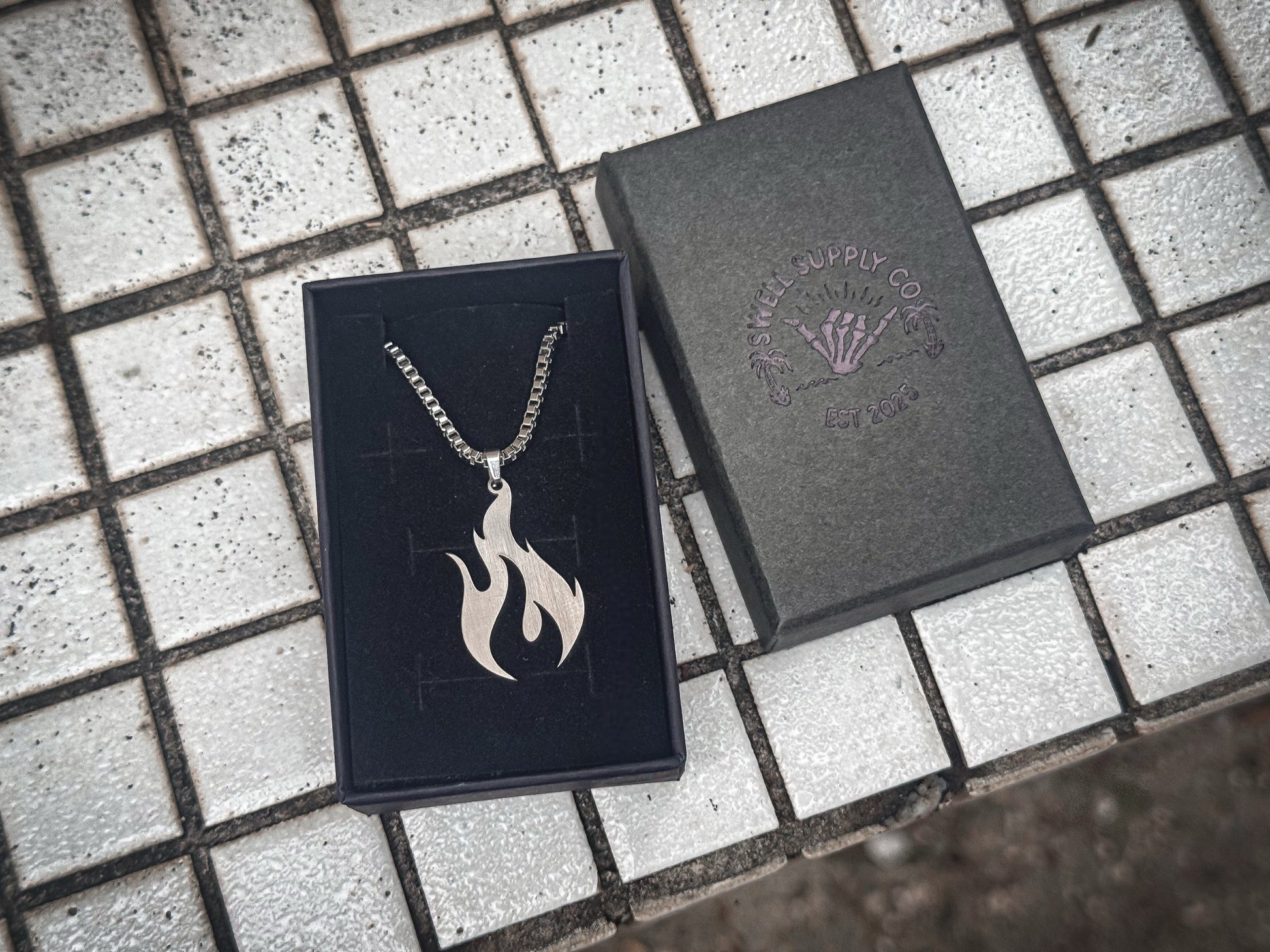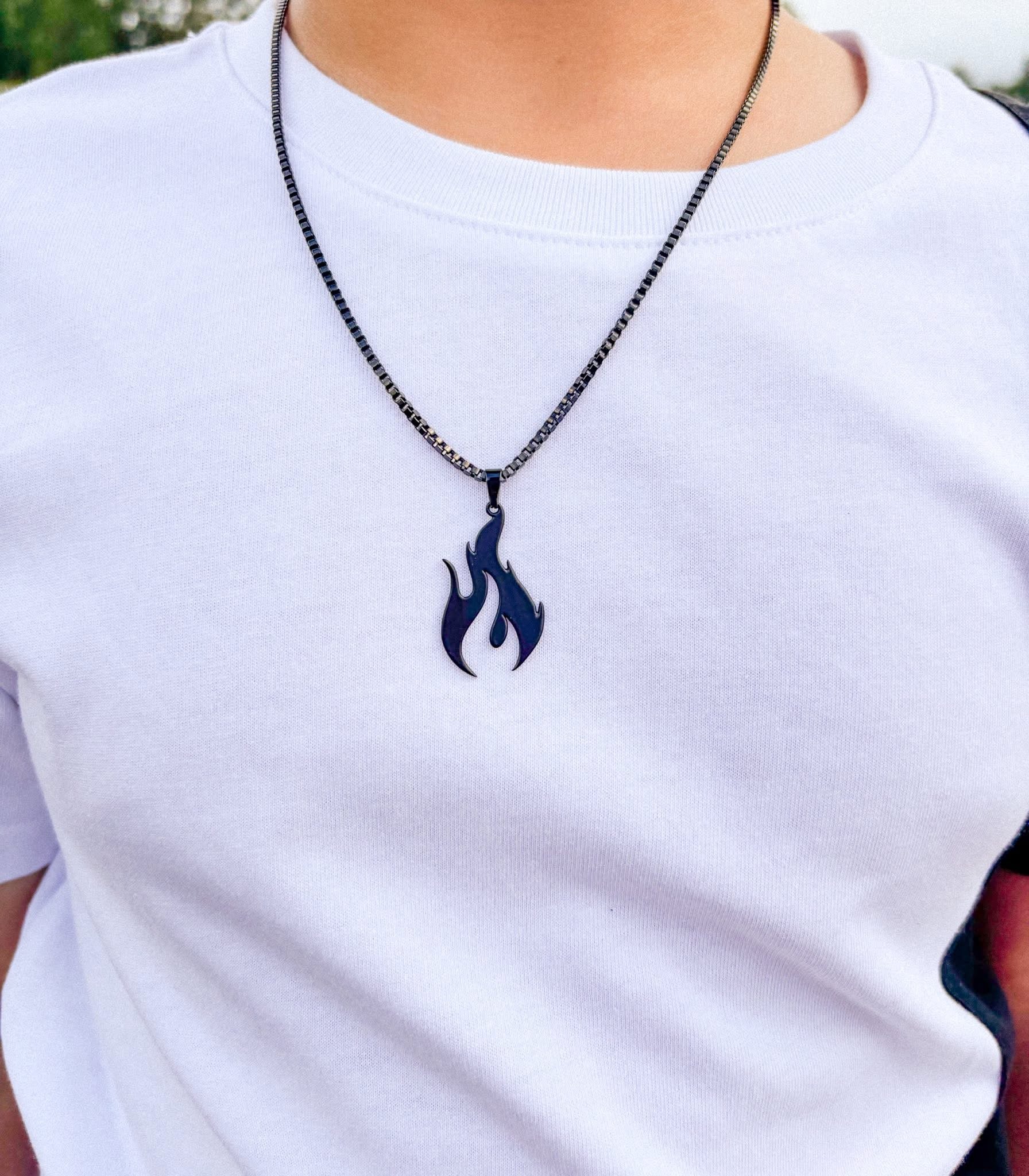 Black or silver sterling silver box chain with flame pendant