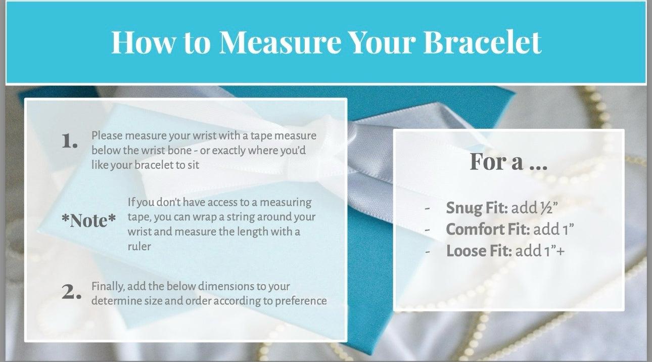 MEASURE, MEASURE, MEASURE! Did I say measure? 😍 I hand make EVERY bracelet to size. PLEASE, determine your wrist size by measuring the thinnest part of your wrist and adding ½ inch. This looks best when measured properly for optimal comfort and wear.