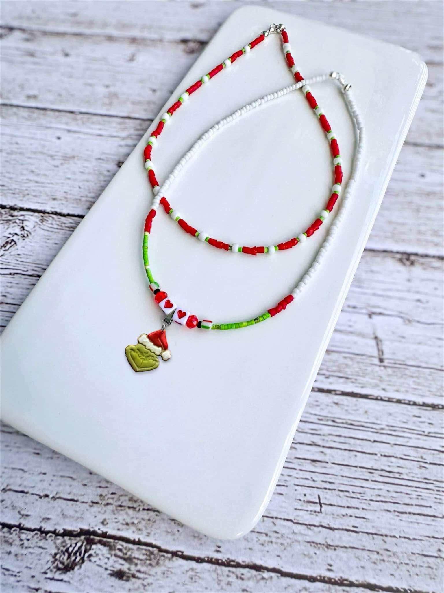 Beaded necklace with .925 Sterling silver clasps. Option 2 Includes a hand crafted clay grinch charm. Both made with Afghanistan lime green turquoise heishi beads and African powder sandcast glass beads. Available in 16 inch, 18 inch, and 20 inch. All jewelry is hand crafted in the U.S.A.