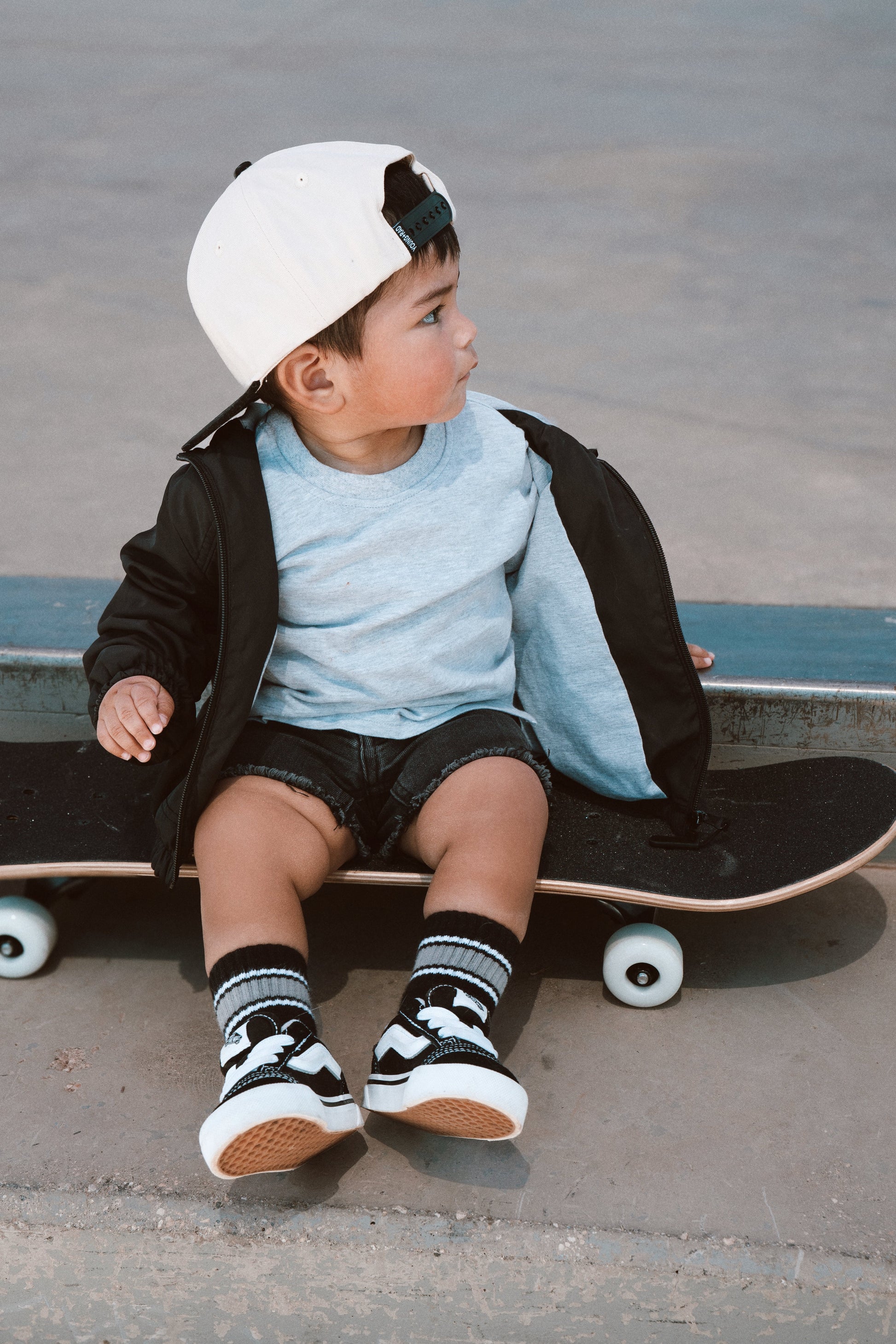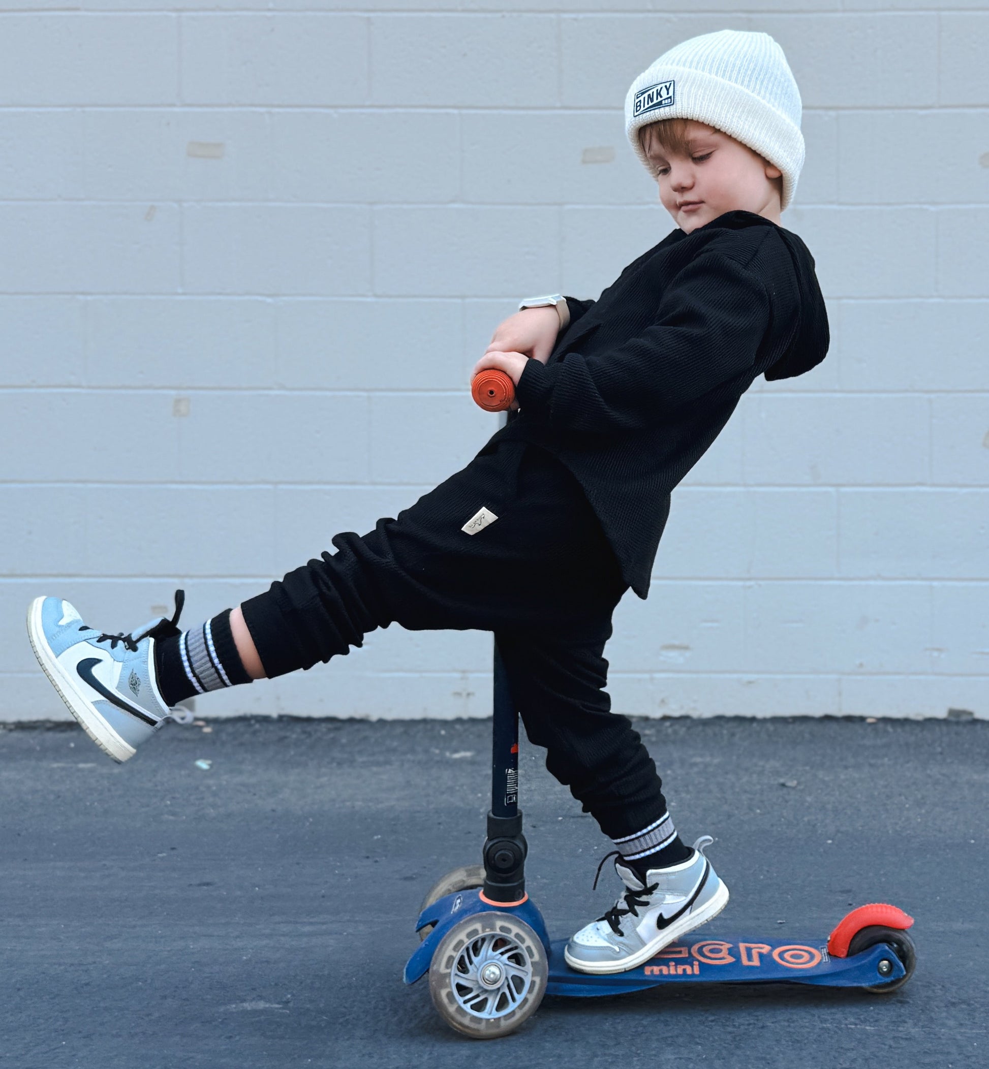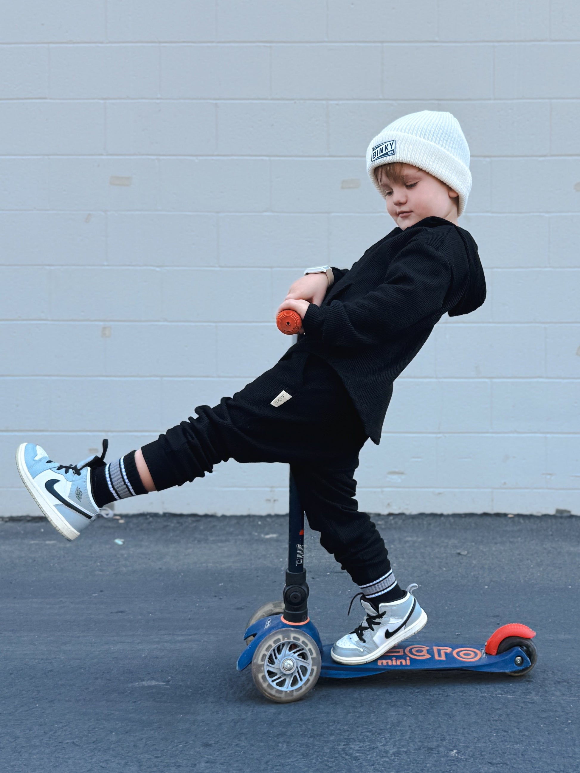 Sizes Infant, Extra Small, Small, Medium have logo grips on the bottom of the feet large have a stitched logo on the bottom of the feet.