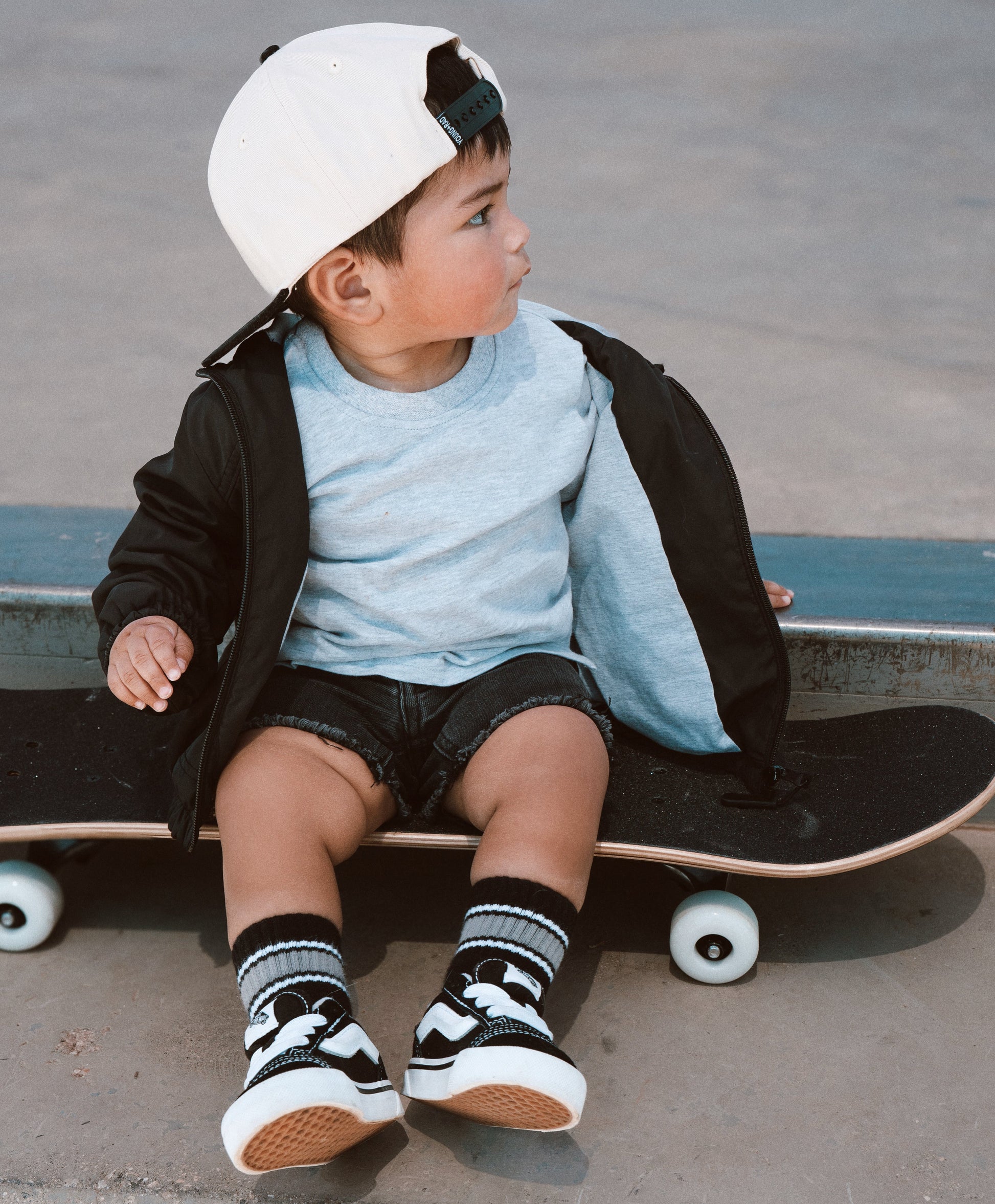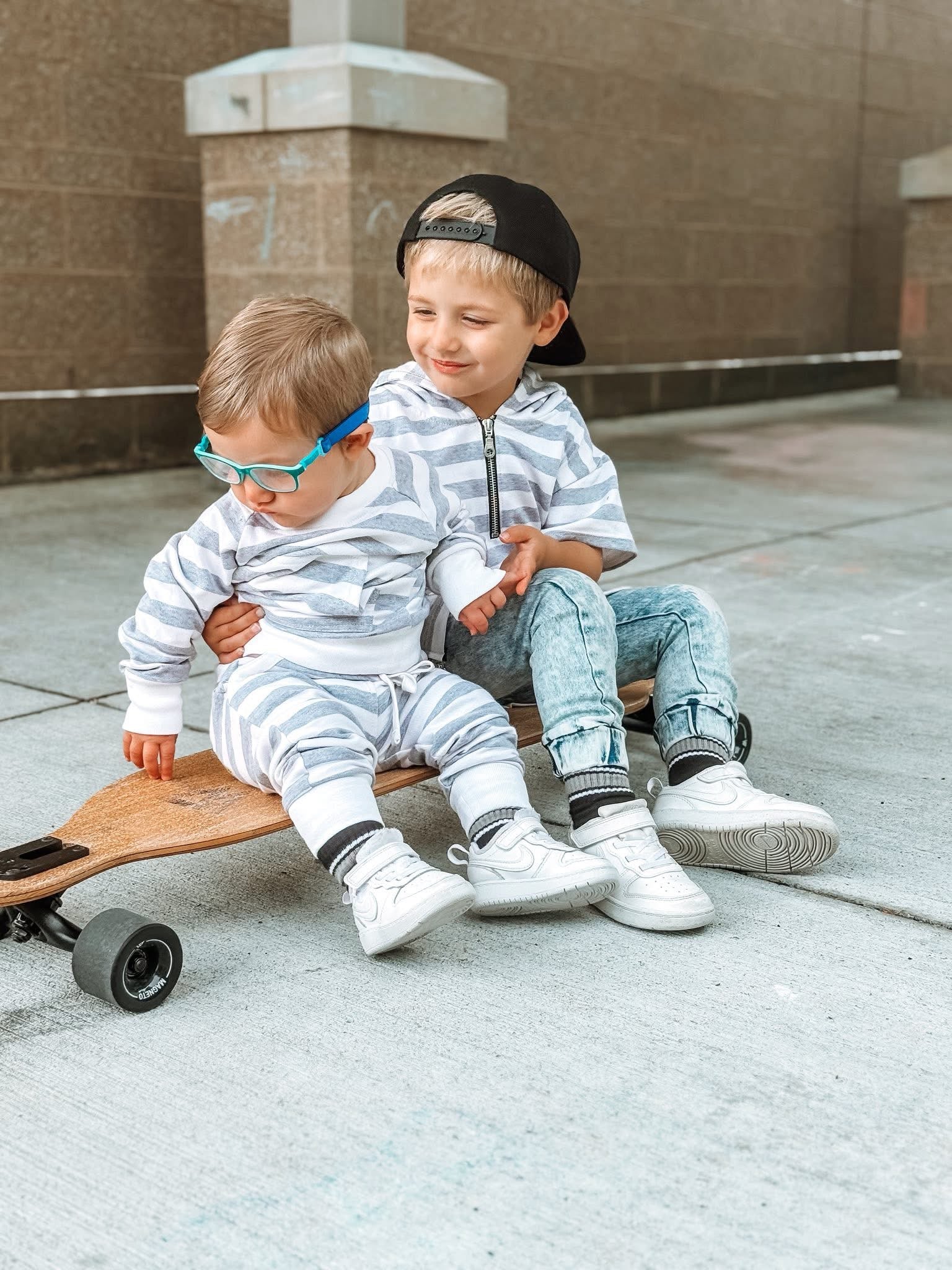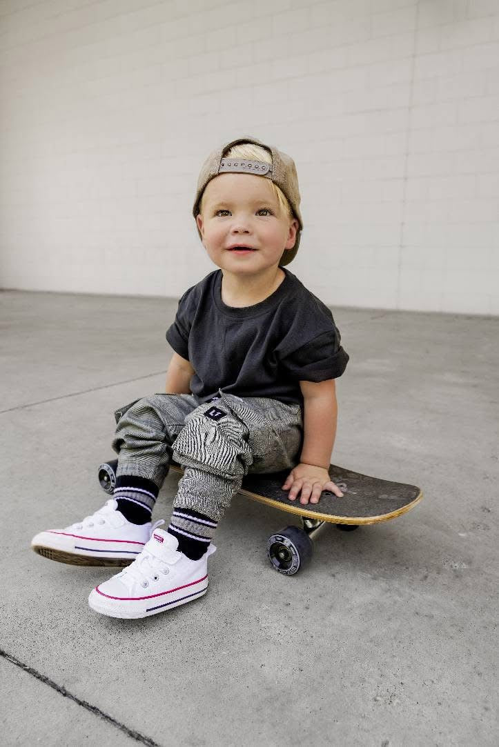 Sizes Infant, Extra Small, Small, Medium have logo grips on the bottom of the feet large have a stitched logo on the bottom of the feet.
