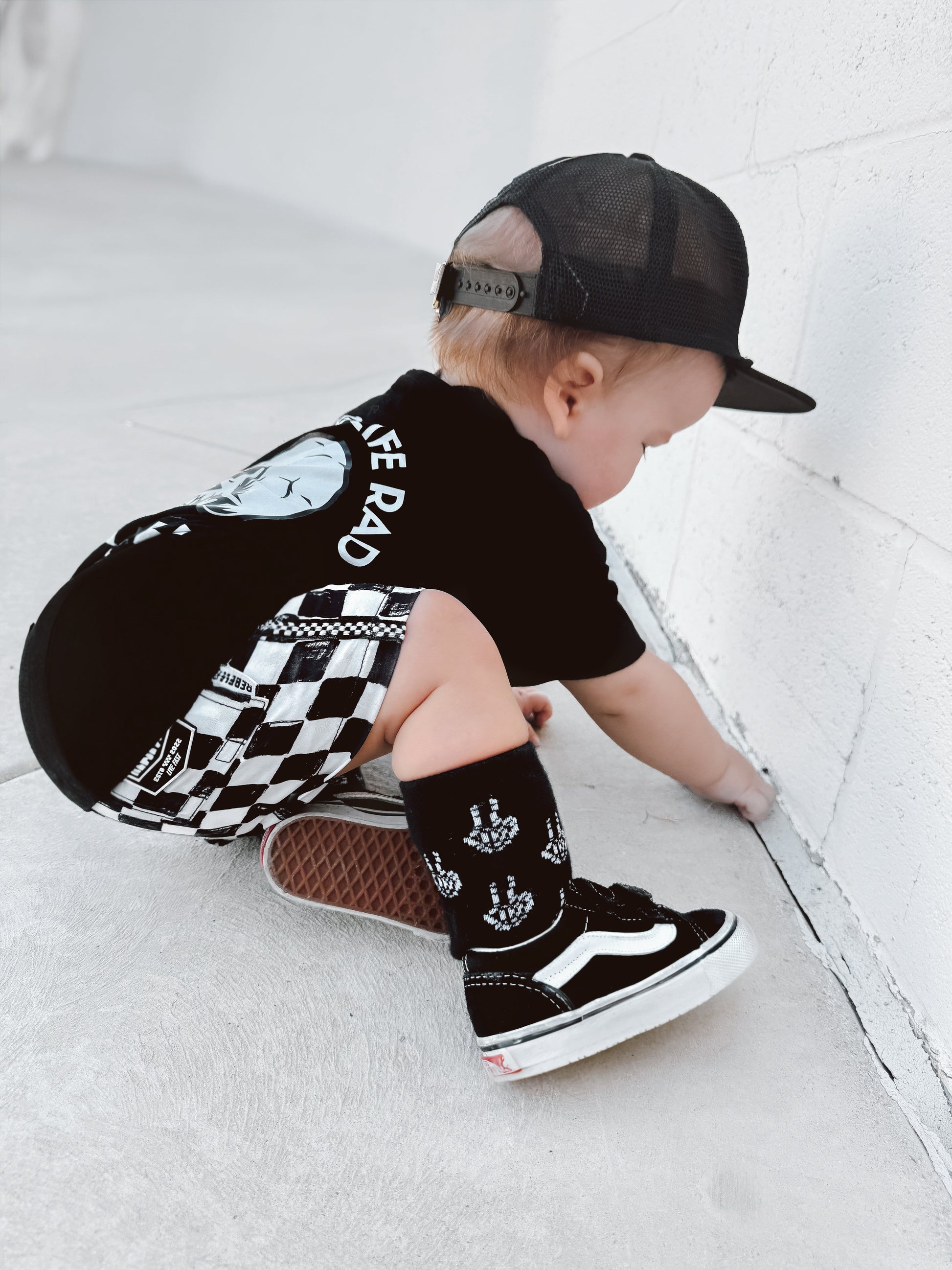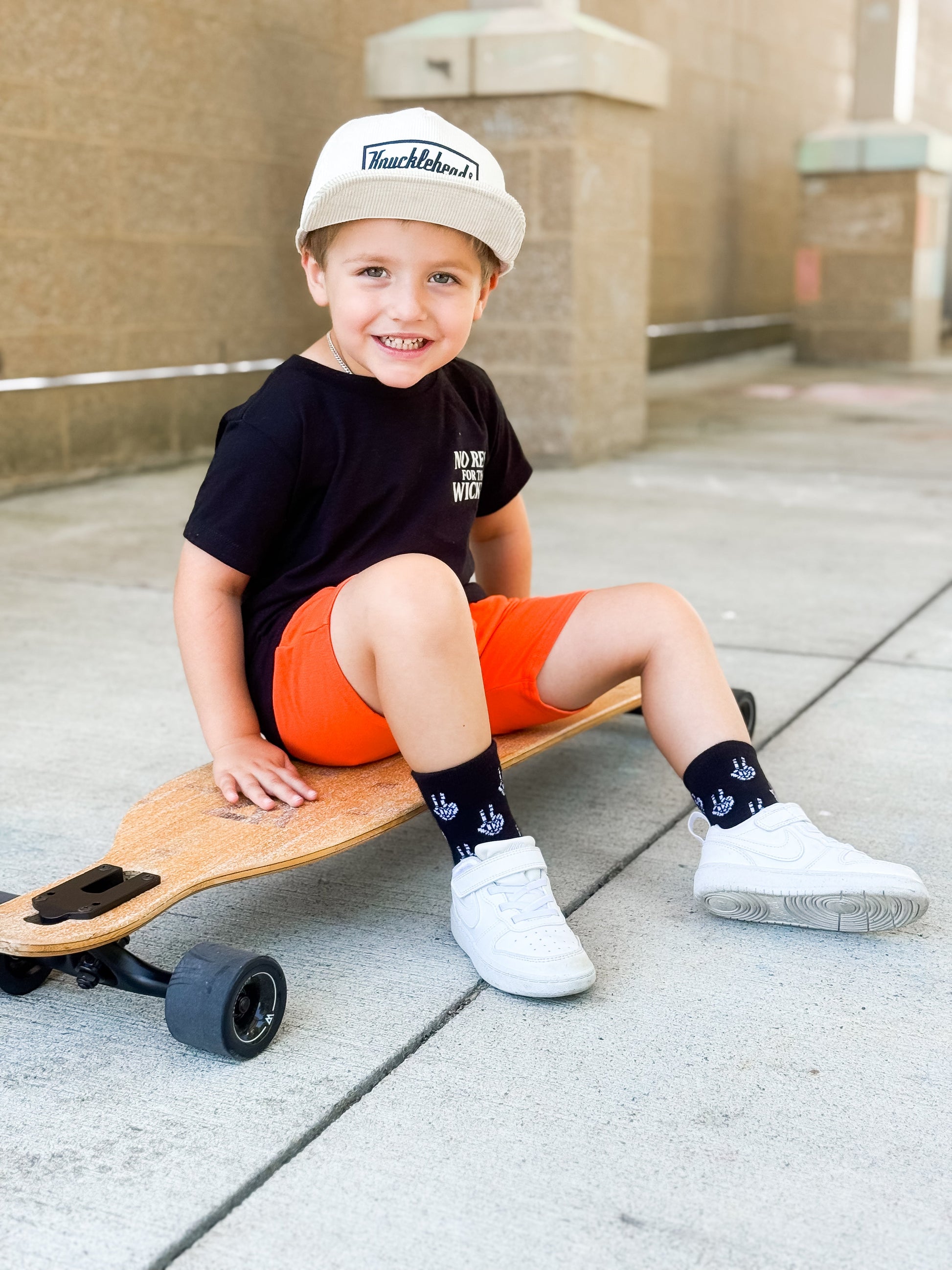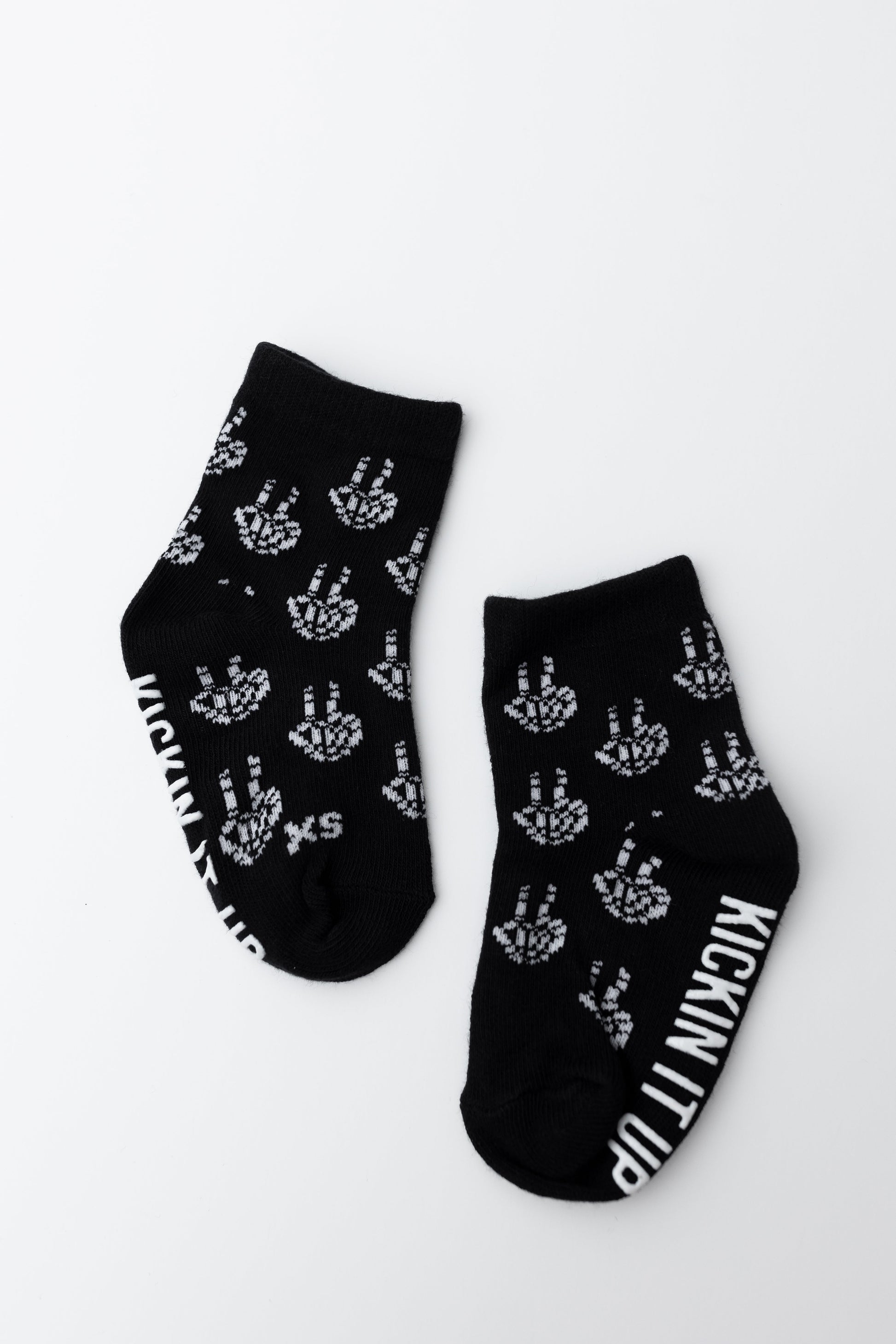 Sizes Infant, Extra Small, Small, Medium have logo grips on the bottom of the feet large have a stitched logo on the bottom of the feet.
