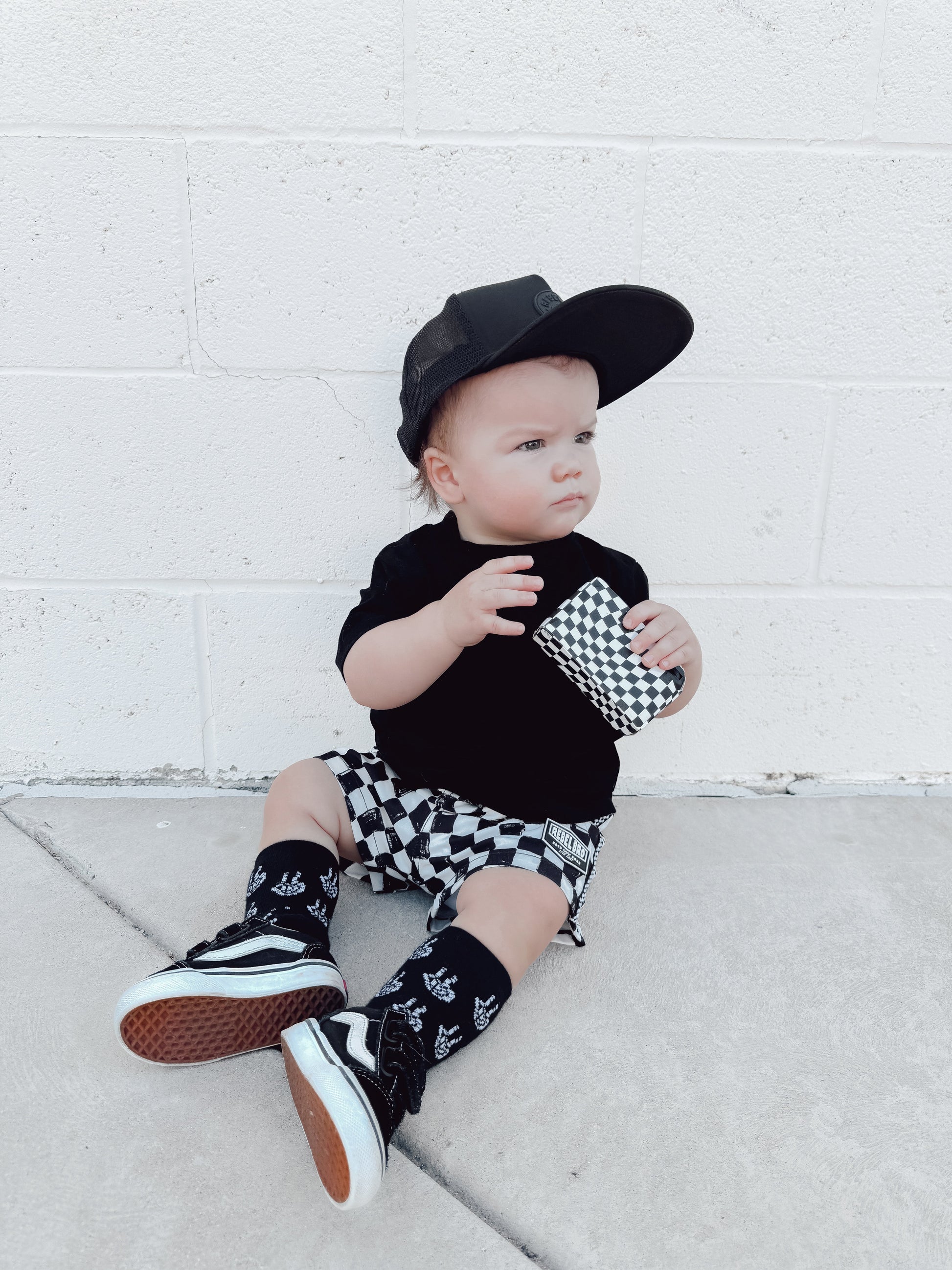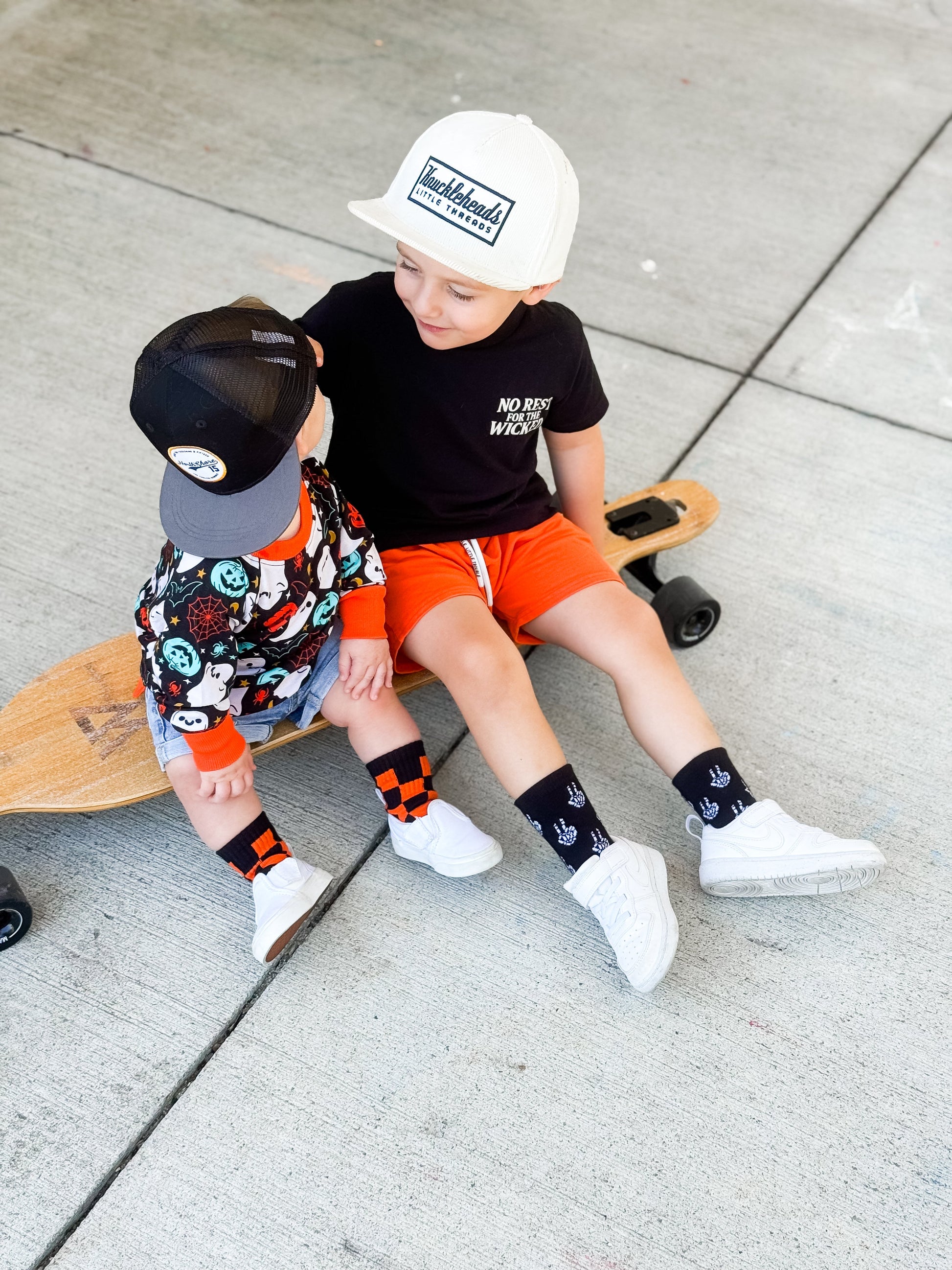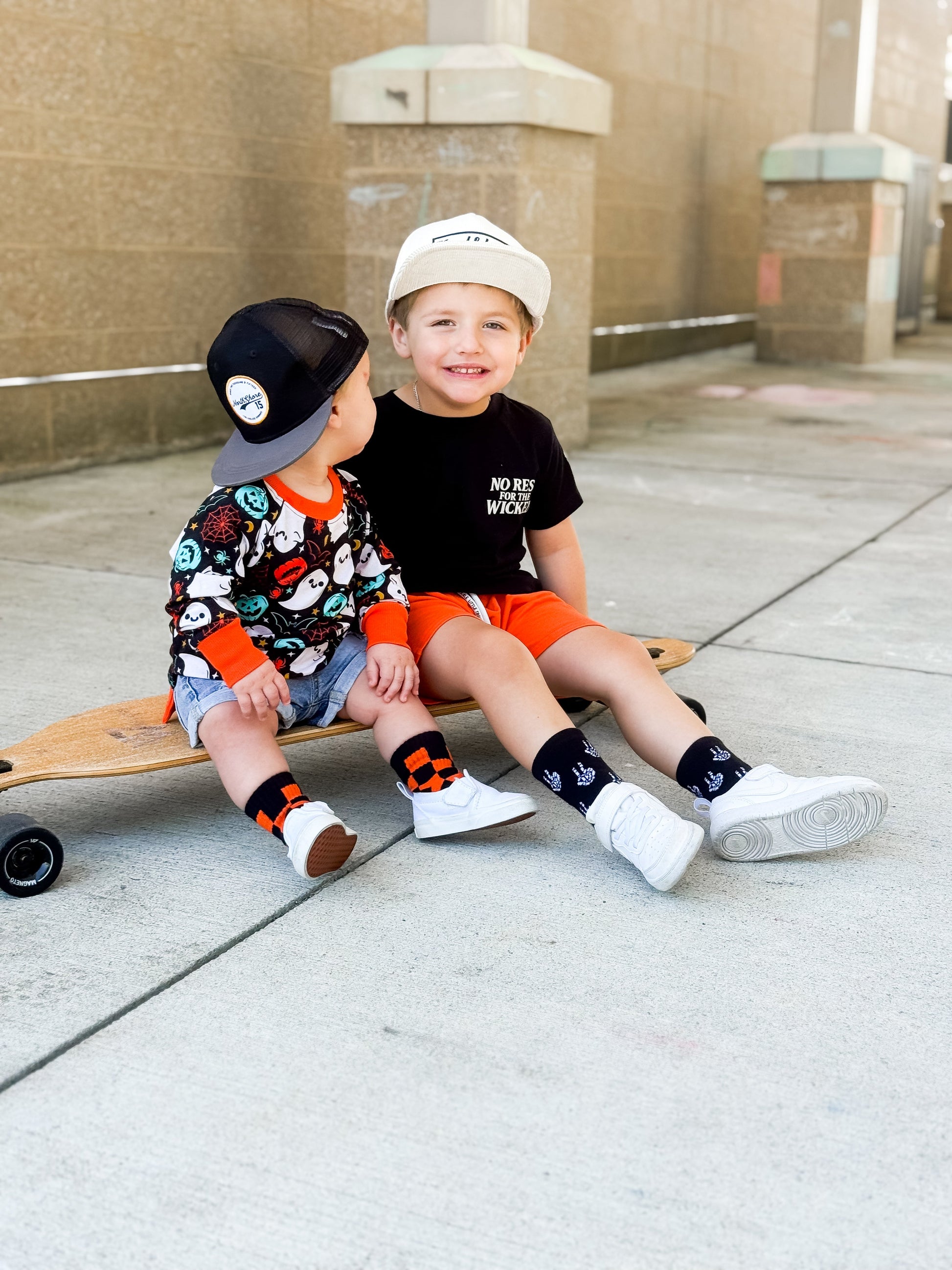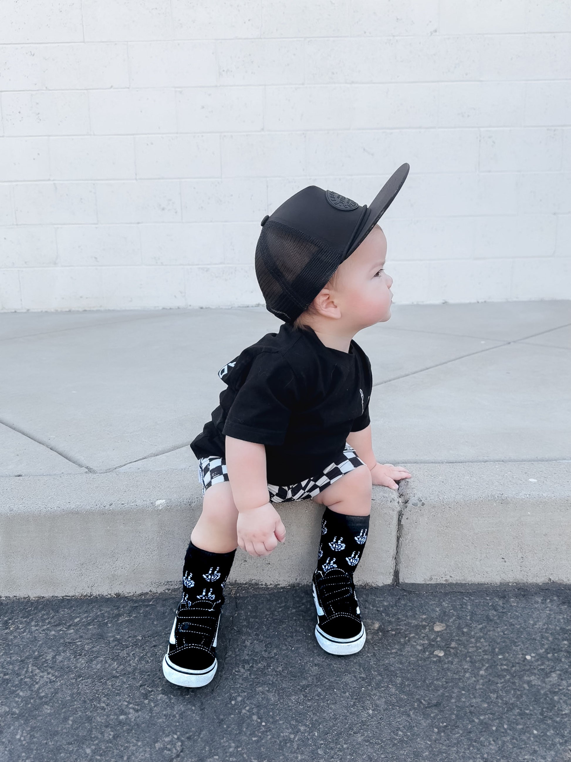 Sizes Infant, Extra Small, Small, Medium have logo grips on the bottom of the feet large have a stitched logo on the bottom of the feet.
