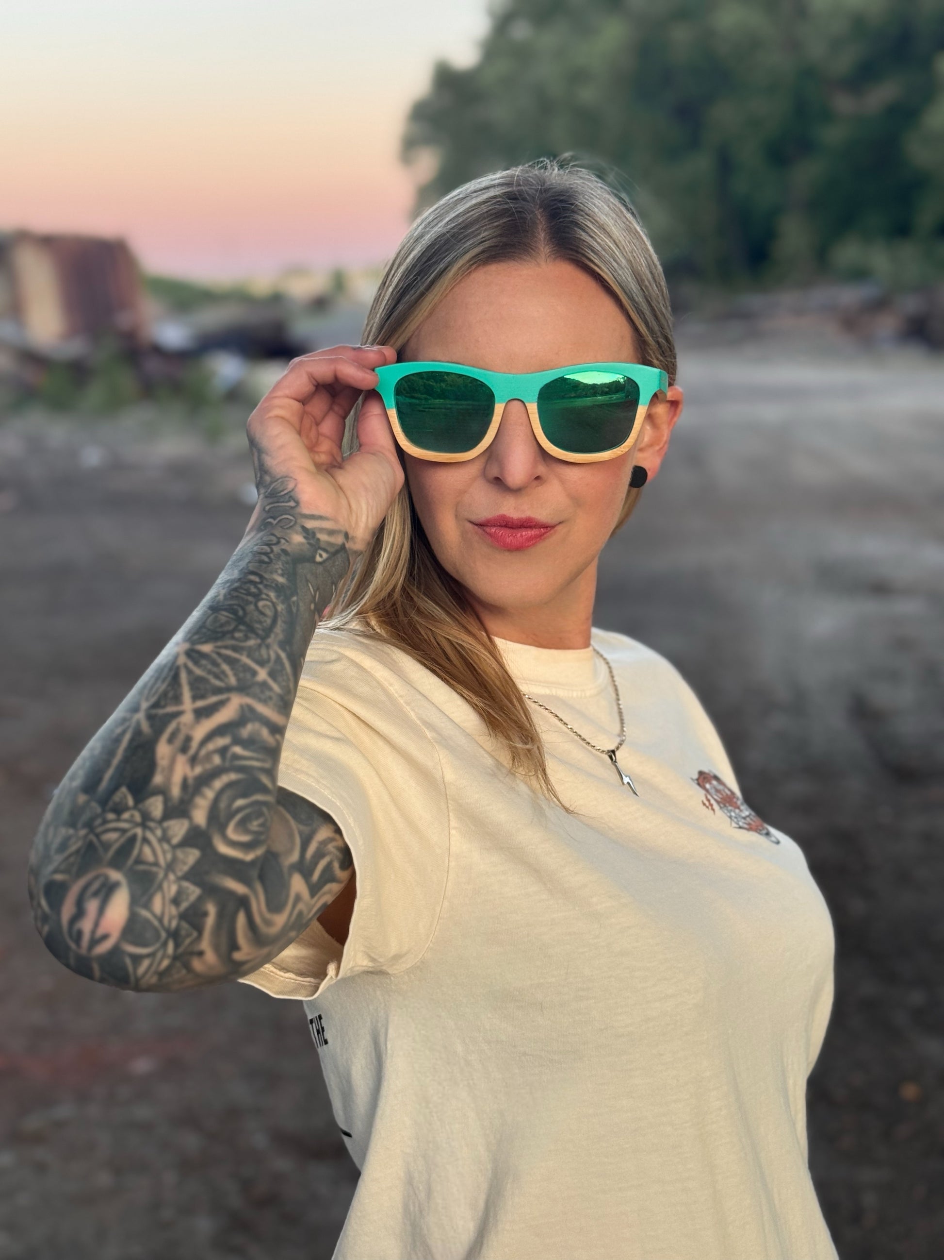 This wayfarer sunny style is half light brown and teal and so fun for spring and summer. The children’s size measures 129mm in width and fit best for ages 2-12 years old. The lightly stained wooden temples are biodegradable and comfortable. The lens is green and is polarized with UV400 for protection.